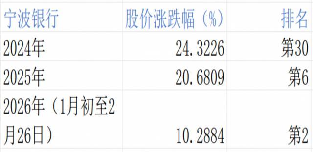 若将时间拉长,Wind显示,宁波银行在2024年的股价涨跌幅为24%,在42家A股上市银行中排在30名;2025年的股价涨跌幅为21%,排在第六名;2026年以来(1月初至2月26日)的股价涨跌幅为10%,排在第二名。